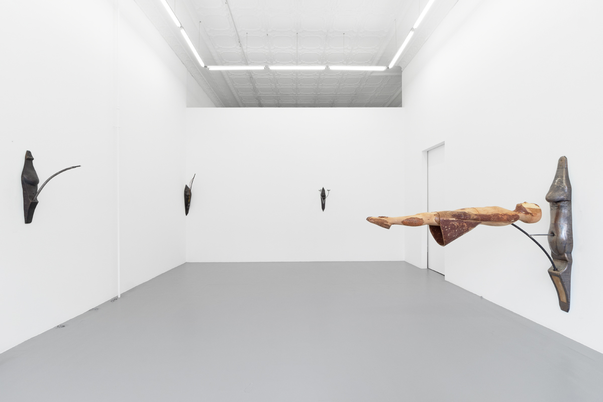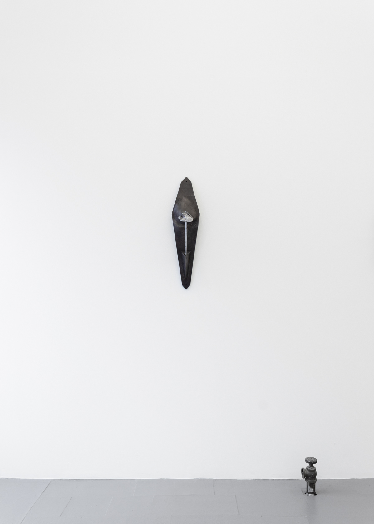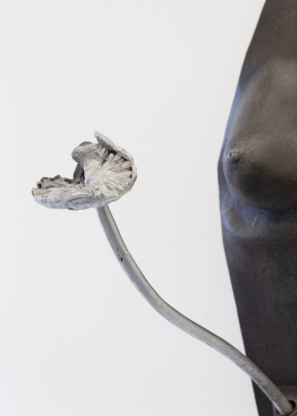 Shana Hoehn presents the body as a site for metamorphosis—the transformative body as a fleshy sarcophagus, a cocoon, a nest, a pulsating house where life and death converge.1 The body of the levitating girl appears calcified, clenched in anticipation as if bracing for impact as transformation takes hold, pummeling through the air, oscillating between states of momentum, suspension, and eruption, of appearance and disappearance, as she hurls into uncertain realms and unfixed states of being. To be human means to be metamorphic; at some point, we are forced to give way as our bodies, relations, and environments shift and change. The cattails and mushrooms that germinate and decay from the breasts of armor seem to whisper embodied knowledge about how to metamorphize well, which sometimes requires us to willingly toss ourselves into states of transformation which require mutability, duality, and uncertainty, whether enacted as acts of survival, self-evolution or otherwise.